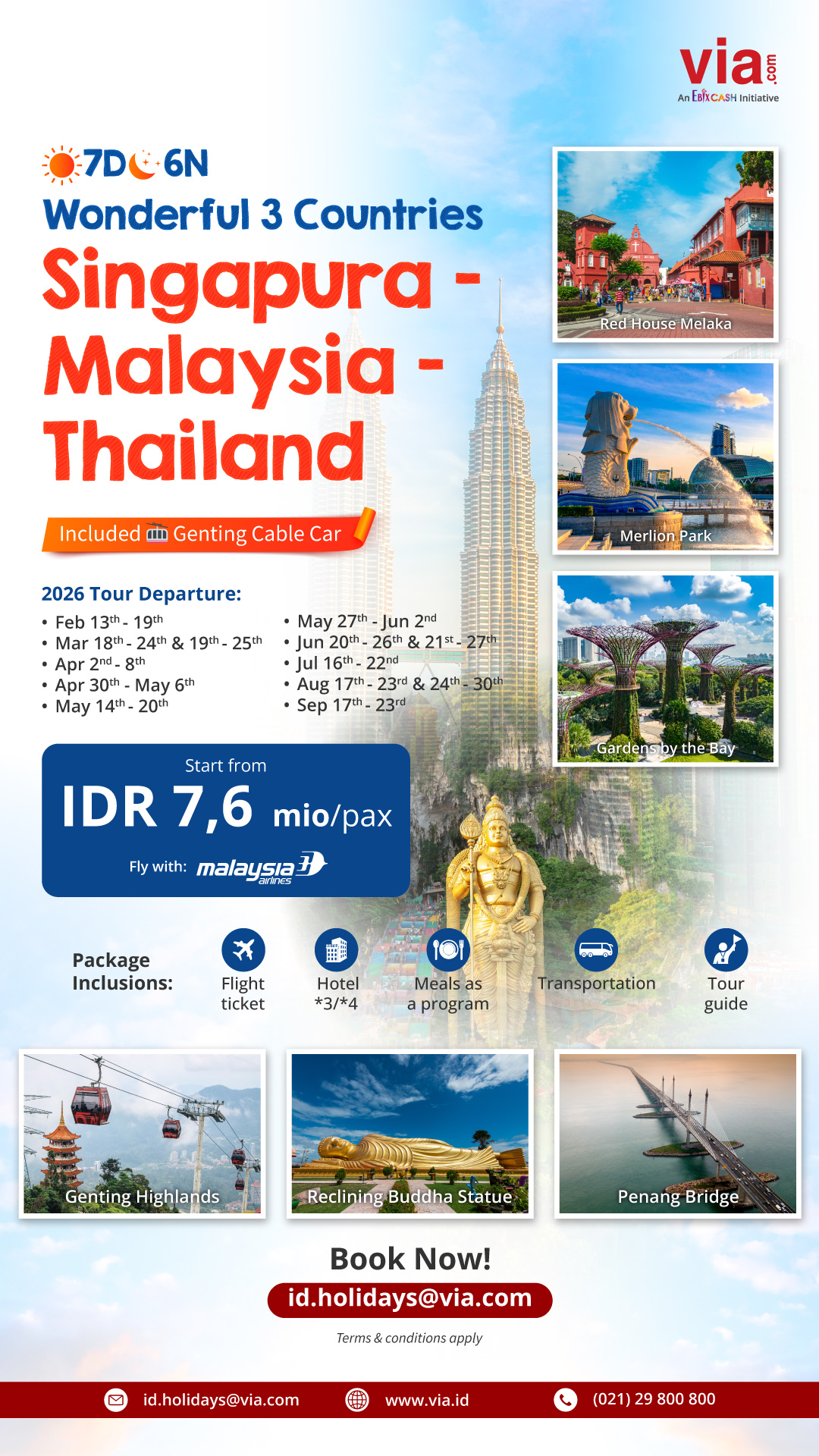 Spend a week exploring three beautiful countries of Southeast Asia with Via.id's special group tour package! Starts from IDR 7,6 mio/pax