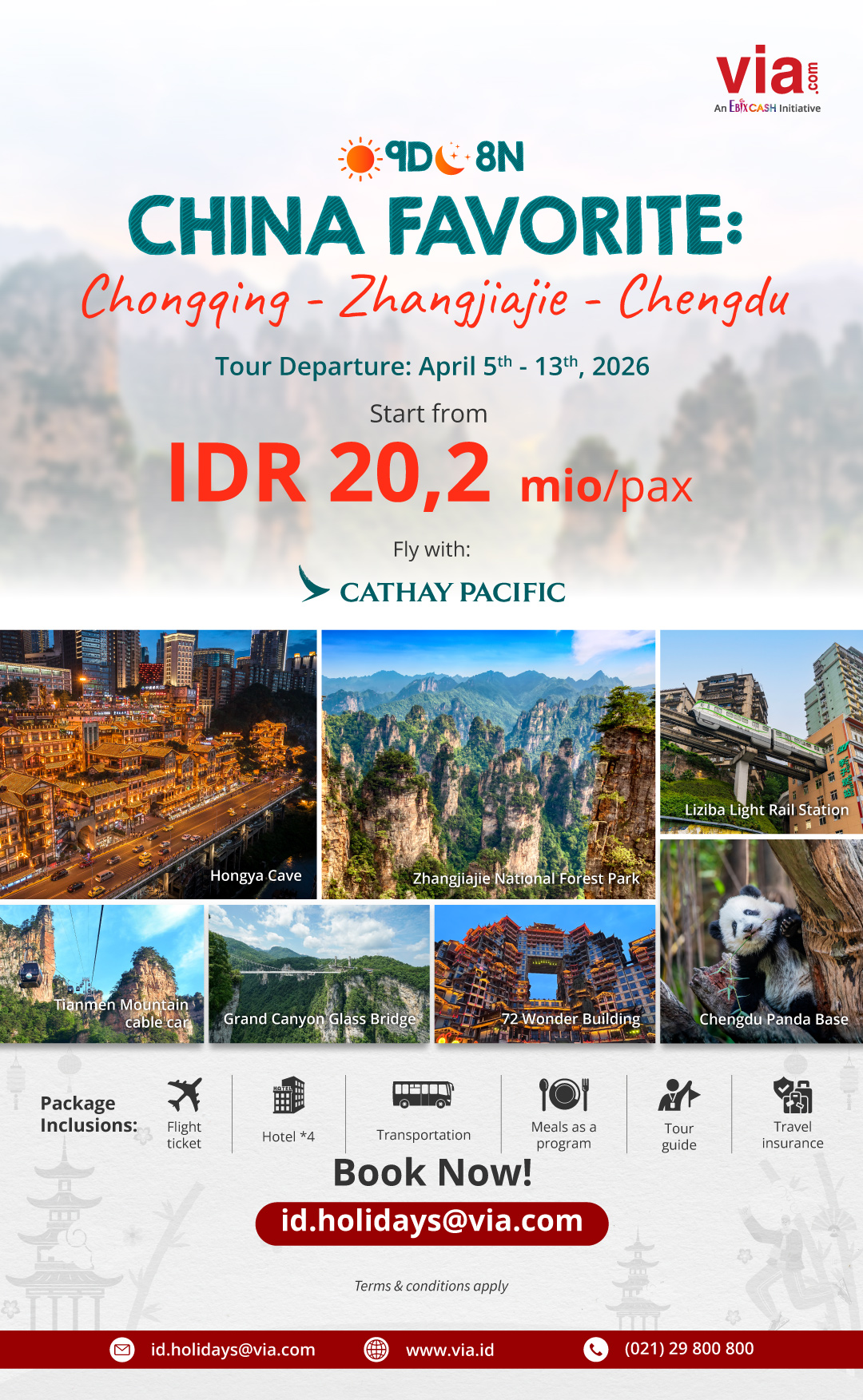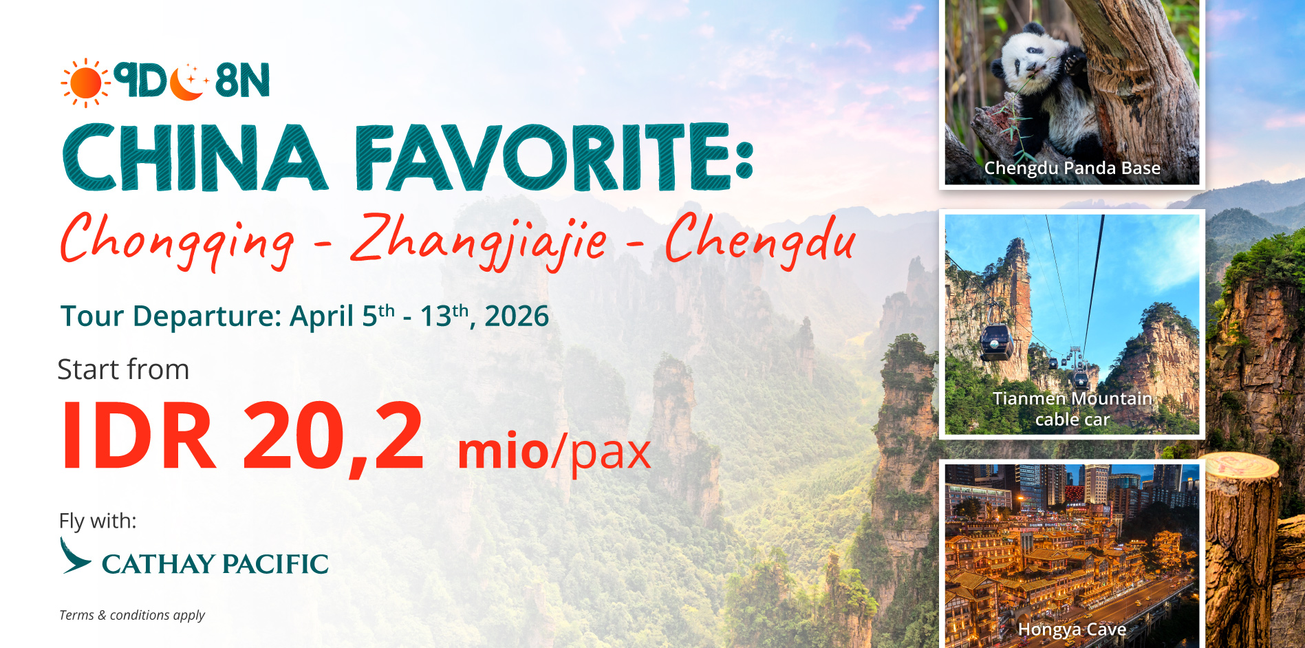 Explore the best of Zhangjiajie, Chengdu, and Chongqing with Via's exclusive tour package, start from IDR 20,2 mio/pax.