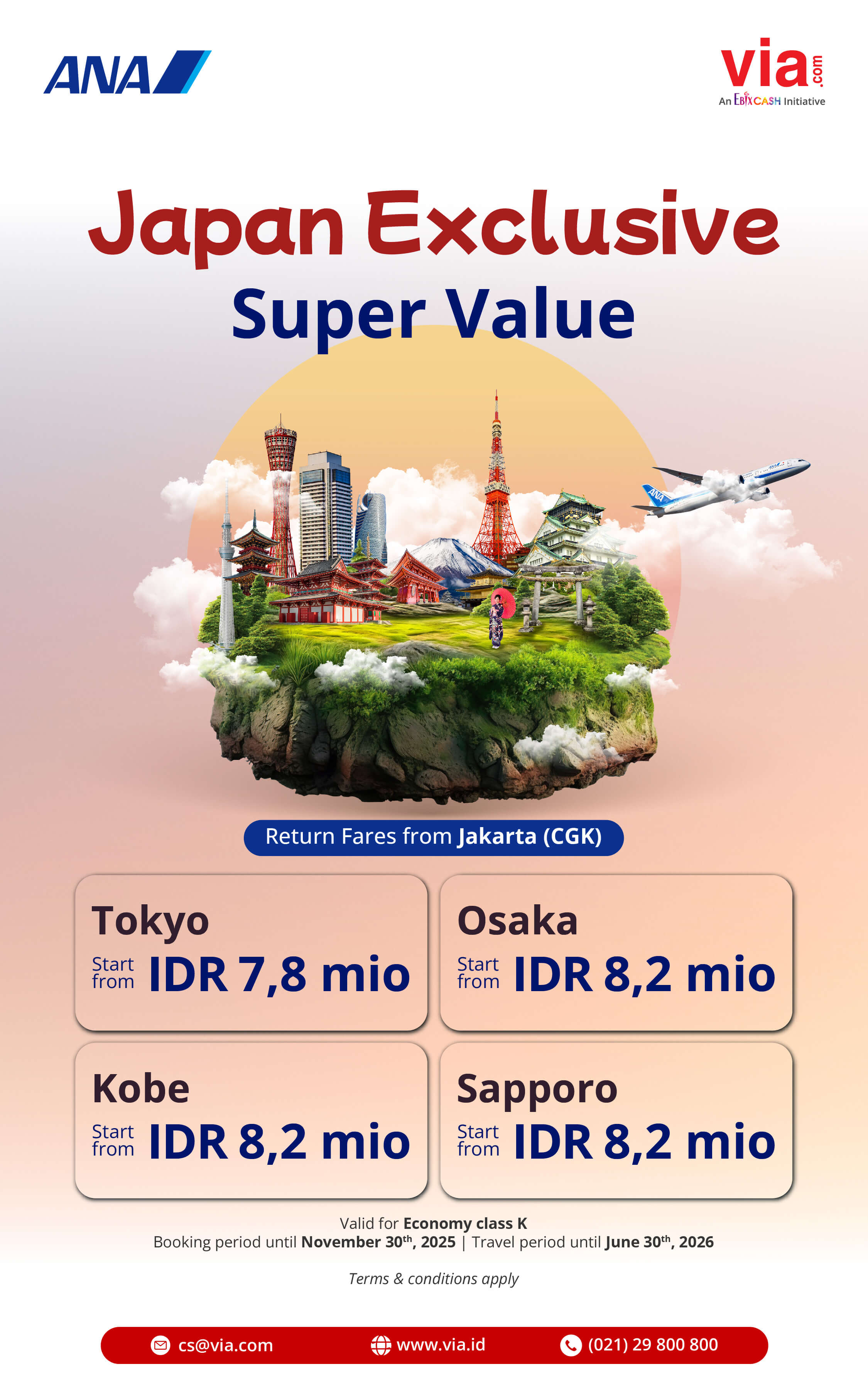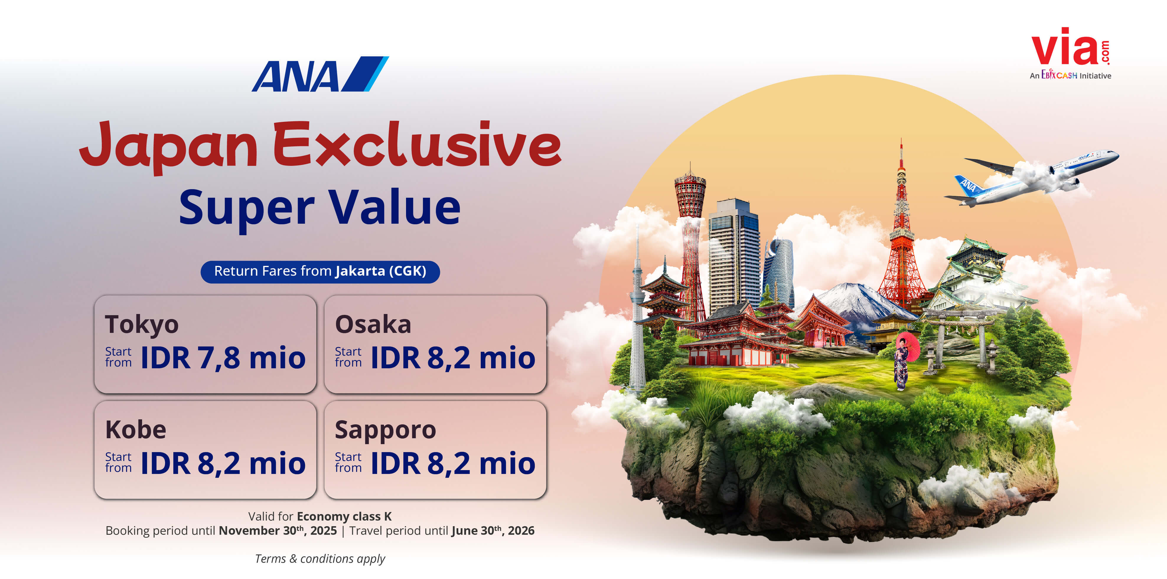 ​ Japan Exclusive Super Value Fare with ANA! Fly from Jakarta to Tokyo, Osaka, Kobe, or Sapporo, return fares start from IDR 7.8 mio. Book your seat today!