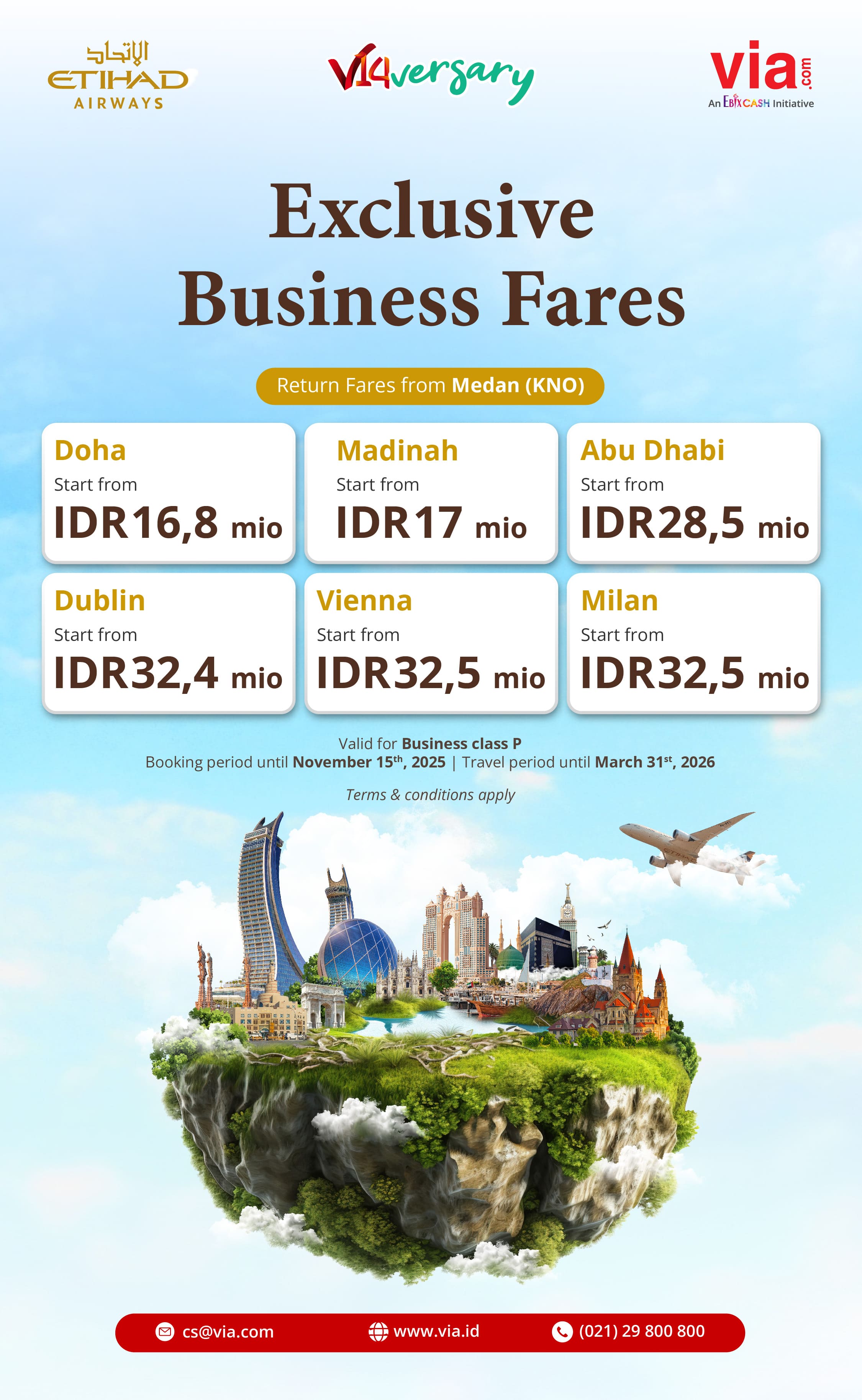 ​ Limited-time promo! Get exclusive Business class fares from Etihad, start from IDR 16,8 mio (return)! ​