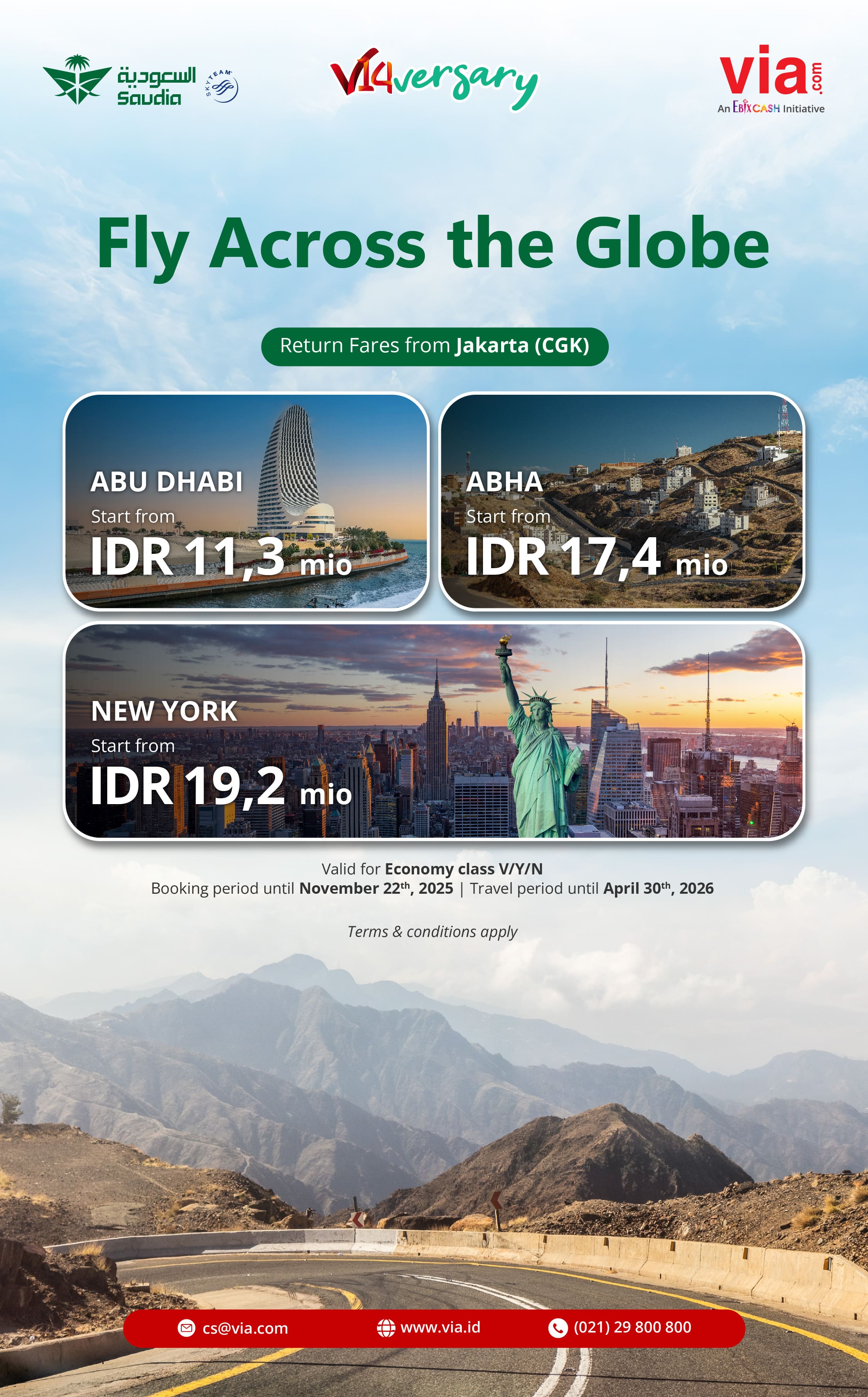 1. Promo valid for return flights. 2. Promo valid for Economy class V/Y/N. 3. Limited seat availability—book early! 4. Fares subject to change without prior notice. 5. Please issue the ticket as soon as possible to avoid difference in fare. 6. Refund and reschedule policy refer to airline.