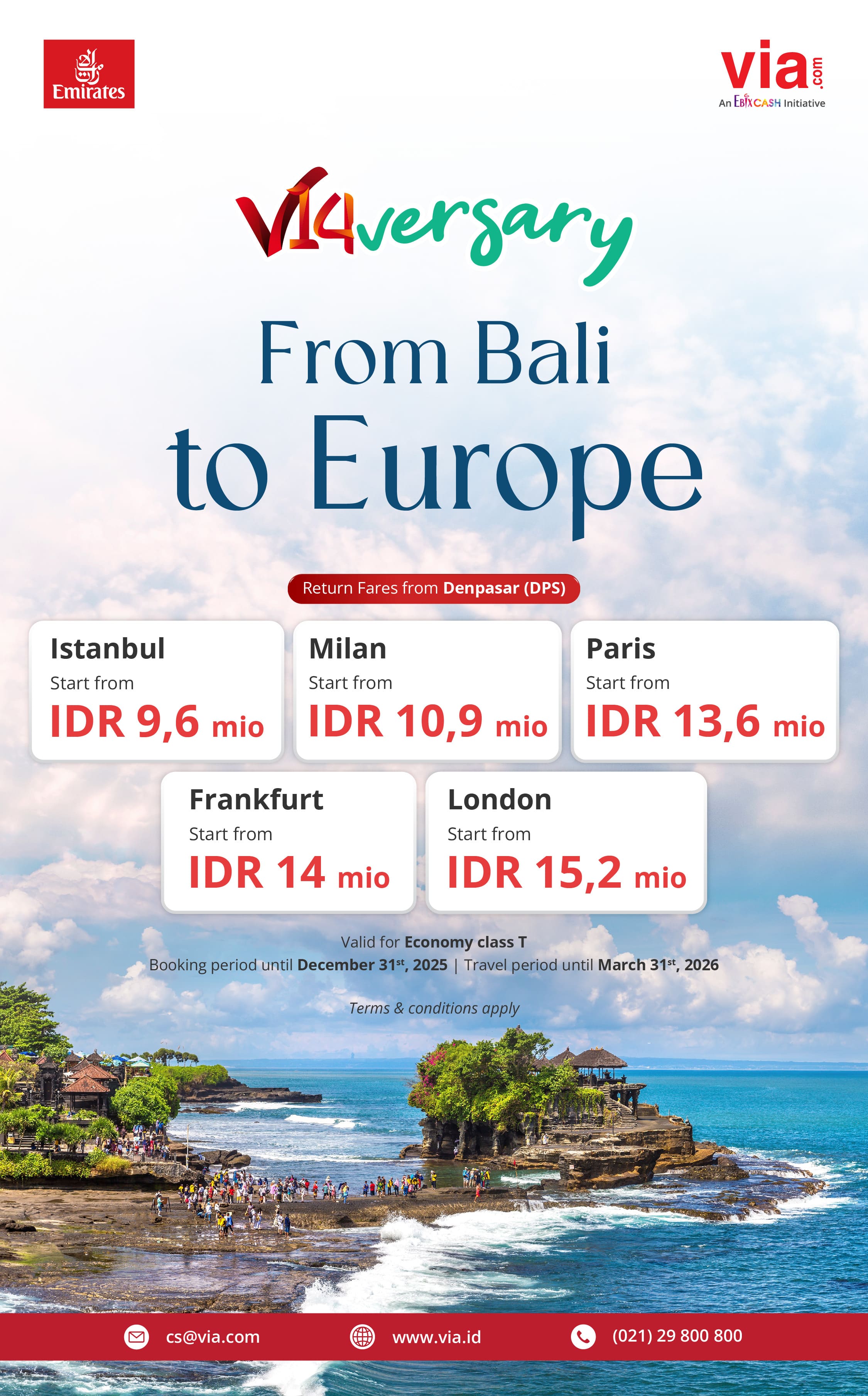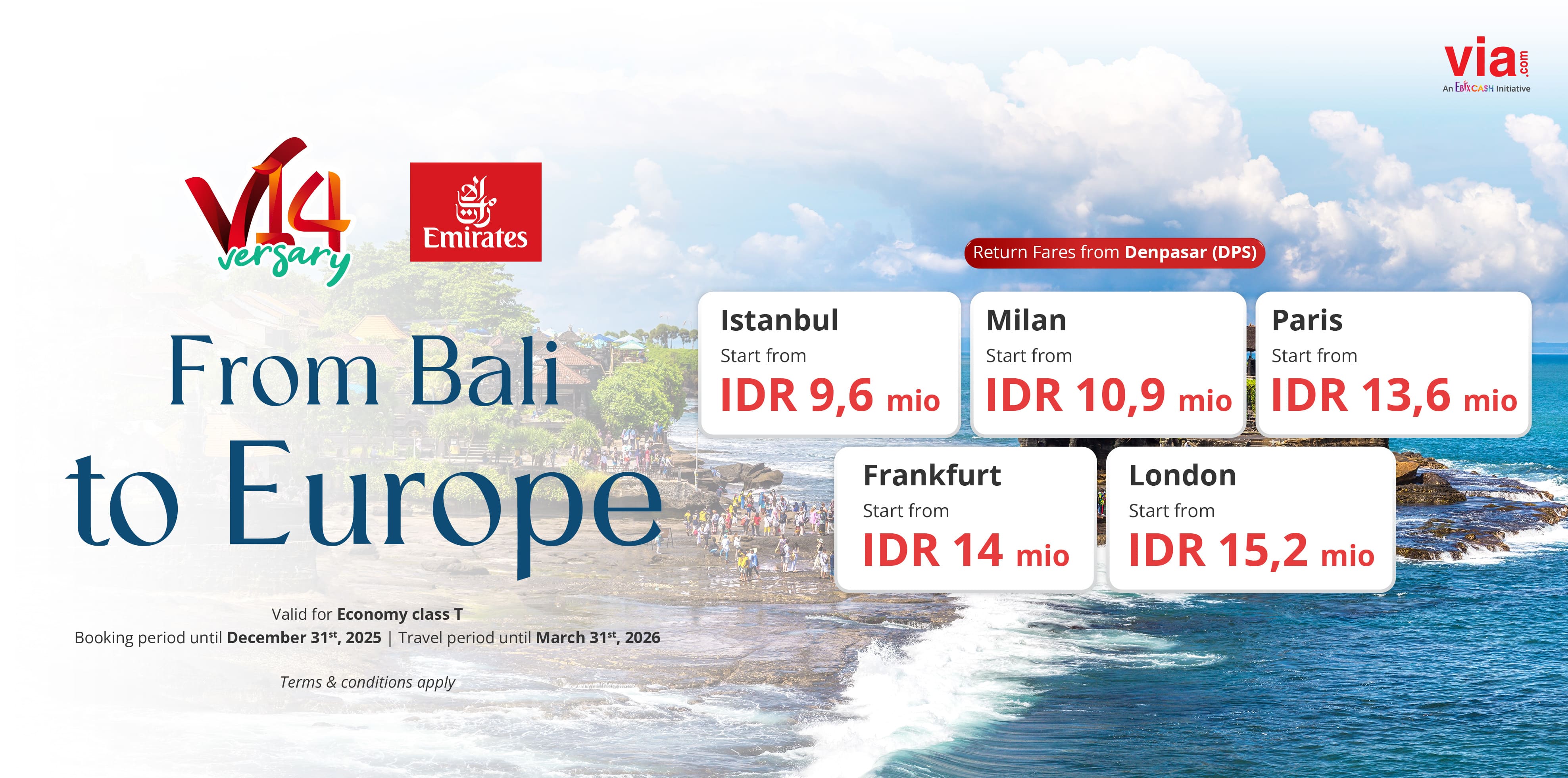 ​ Celebrate Via’s #V14versary with Emirates' flights from Denpasar to Europe, start from IDR 9,6 mio. ​
