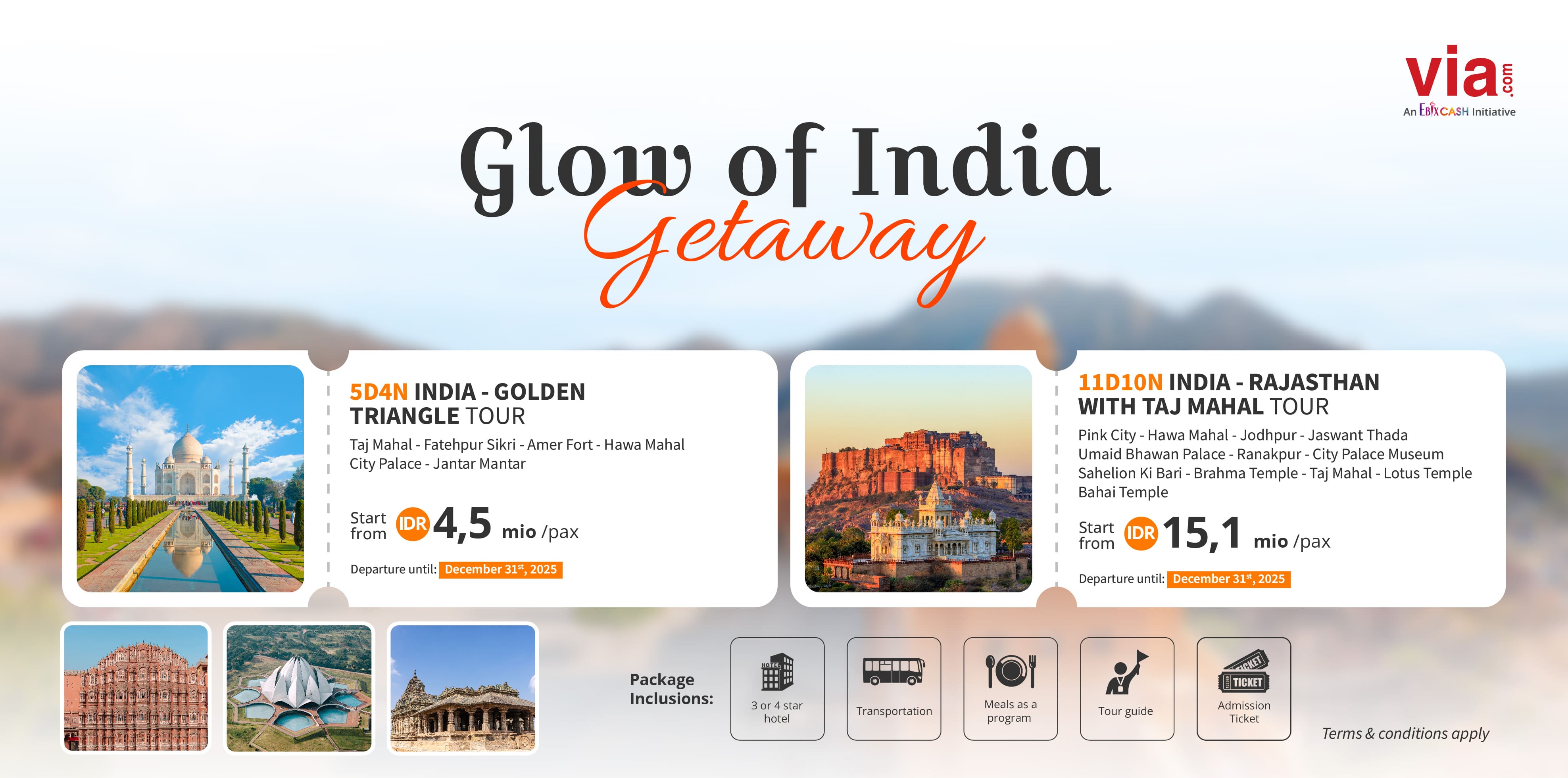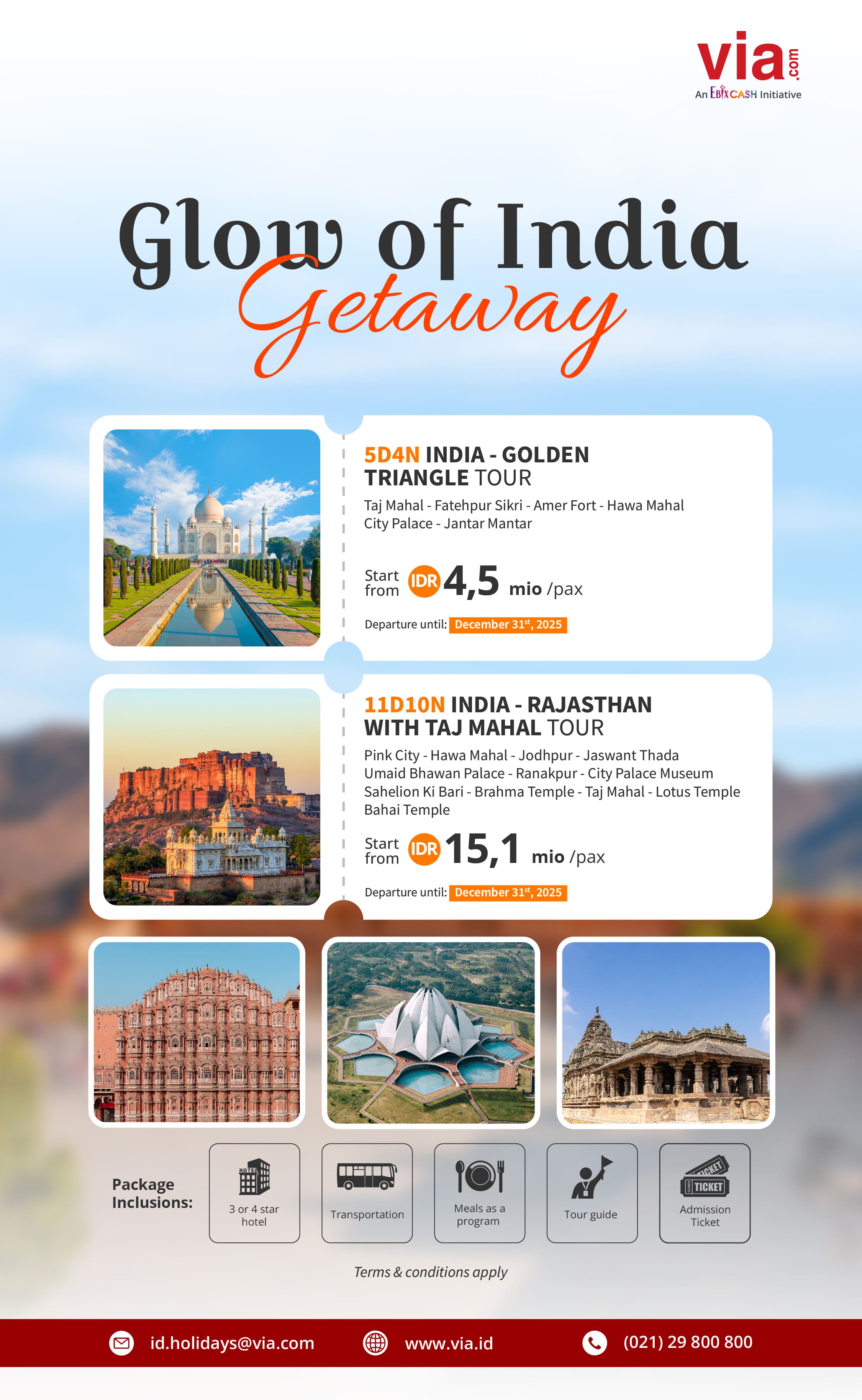 Experience the glow of India getaway with Via's selected tour packages, start from IDR 4,5 mio/pax!