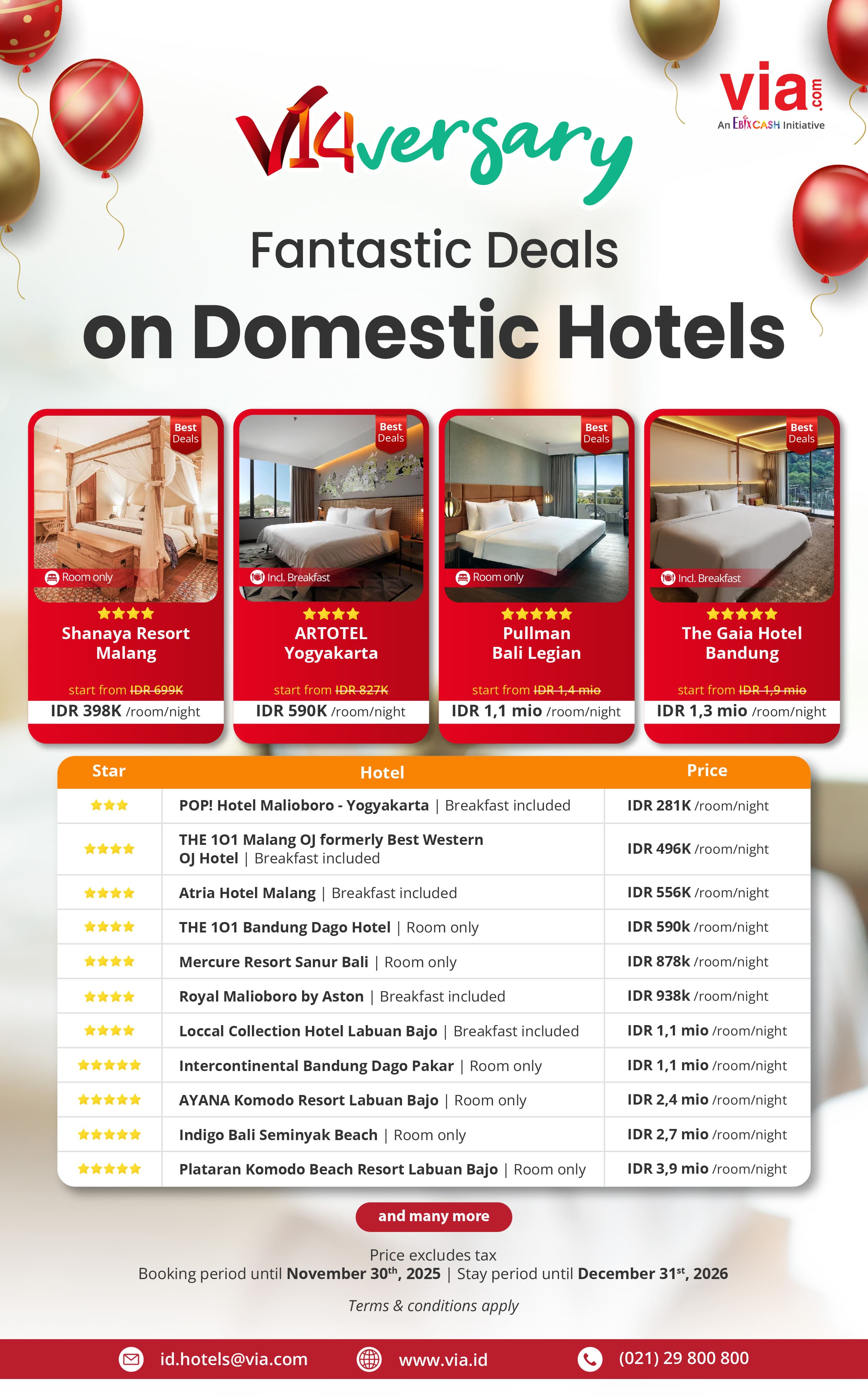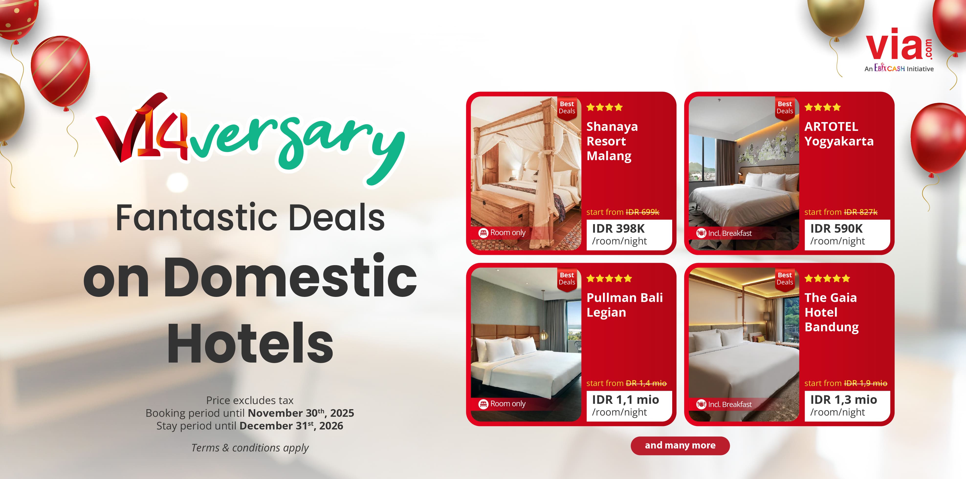 Best domestic hotel deals from V14versary is here! Stays start from IDR 281k/room/night