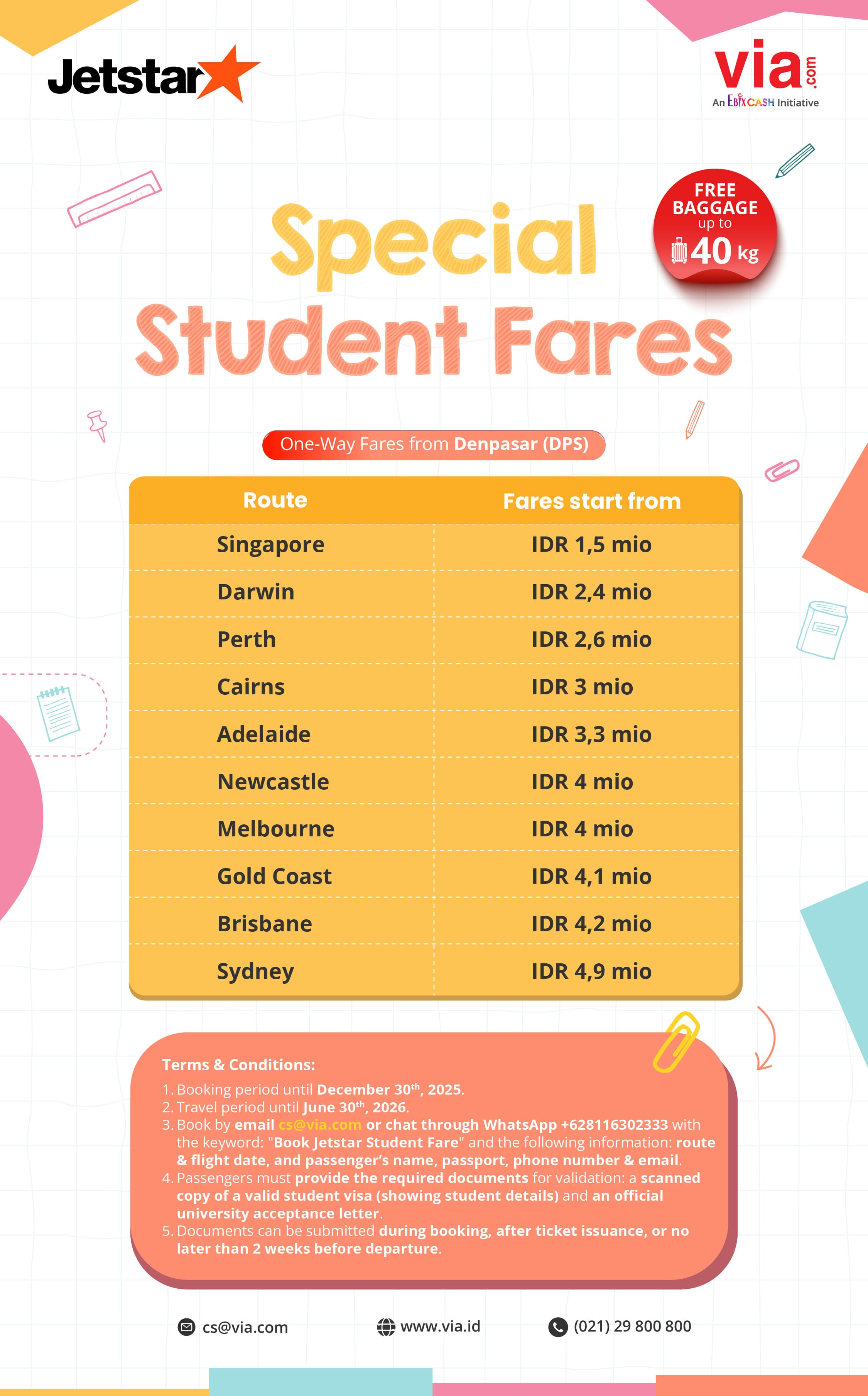 1. Book by email or chat through WhatsApp with the keyword: "Book Jetstar Student Fare" and the following information: route & flight date, and passenger’s name, passport, phone number & email. 2. Passengers must provide the required documents for validation: a scanned copy of a valid student visa (showing student details) and an official university acceptance letter. 3. Documents can be submitted during booking, after ticket issuance, or no later than 2 weeks before departure.
