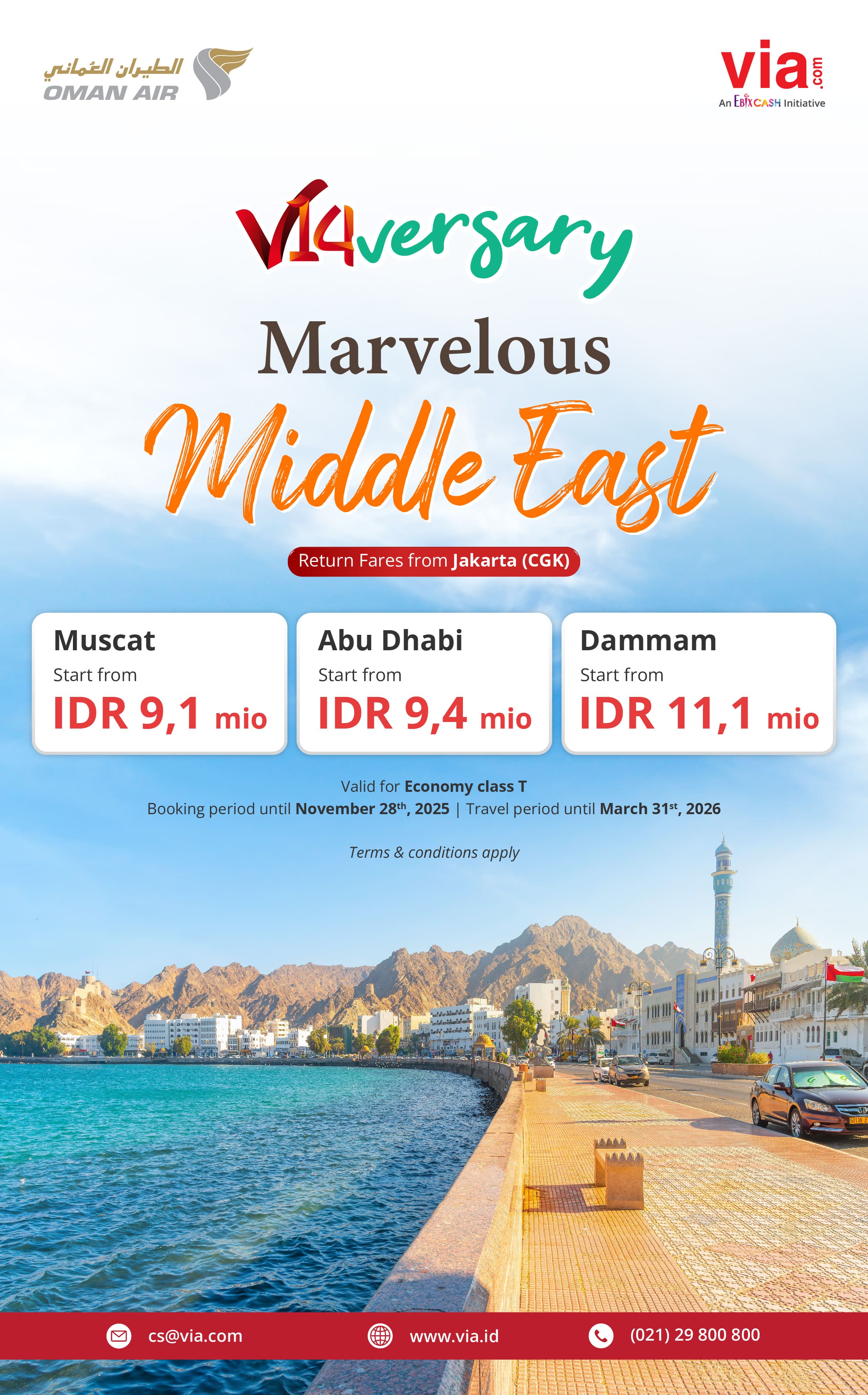 ​ Celebrate Via’s #V14versary with Oman Air! Fly to Muscat, Abu Dhabi, and Dammam start from IDR 9,1 mio. ​