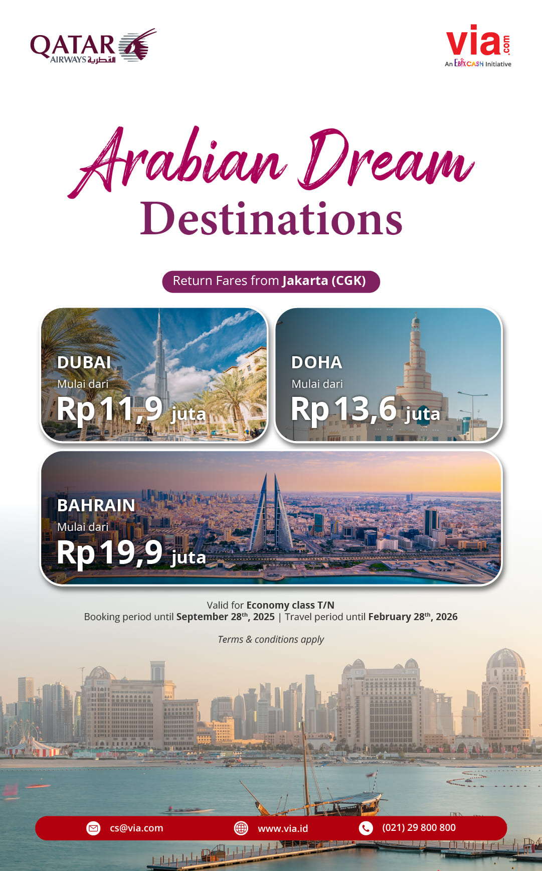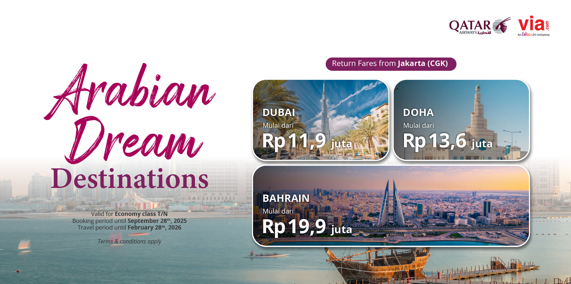 ​ Fly to your Arabian dream destination cities: Dubai, Doha, and Bahrain with Qatar Airways!