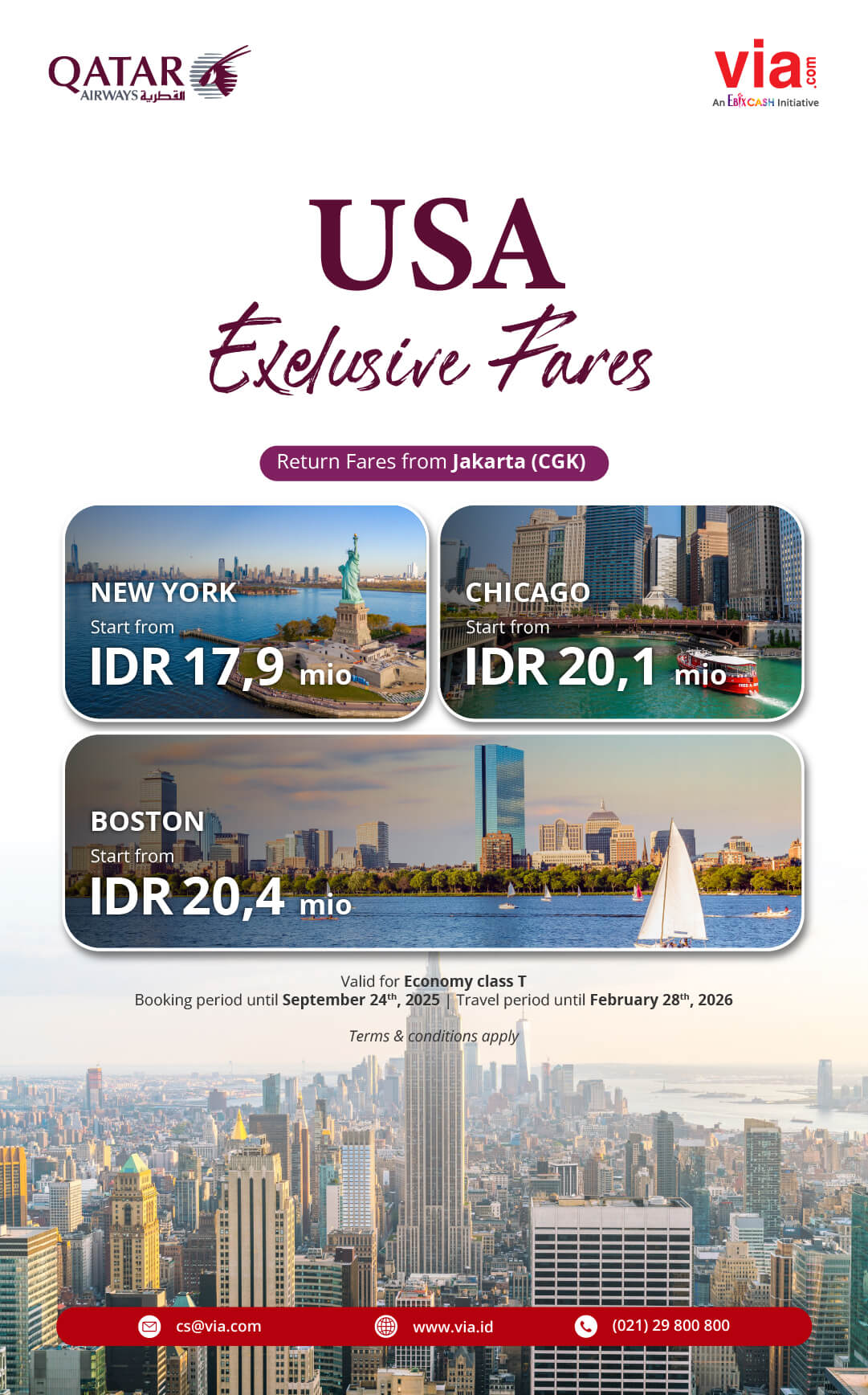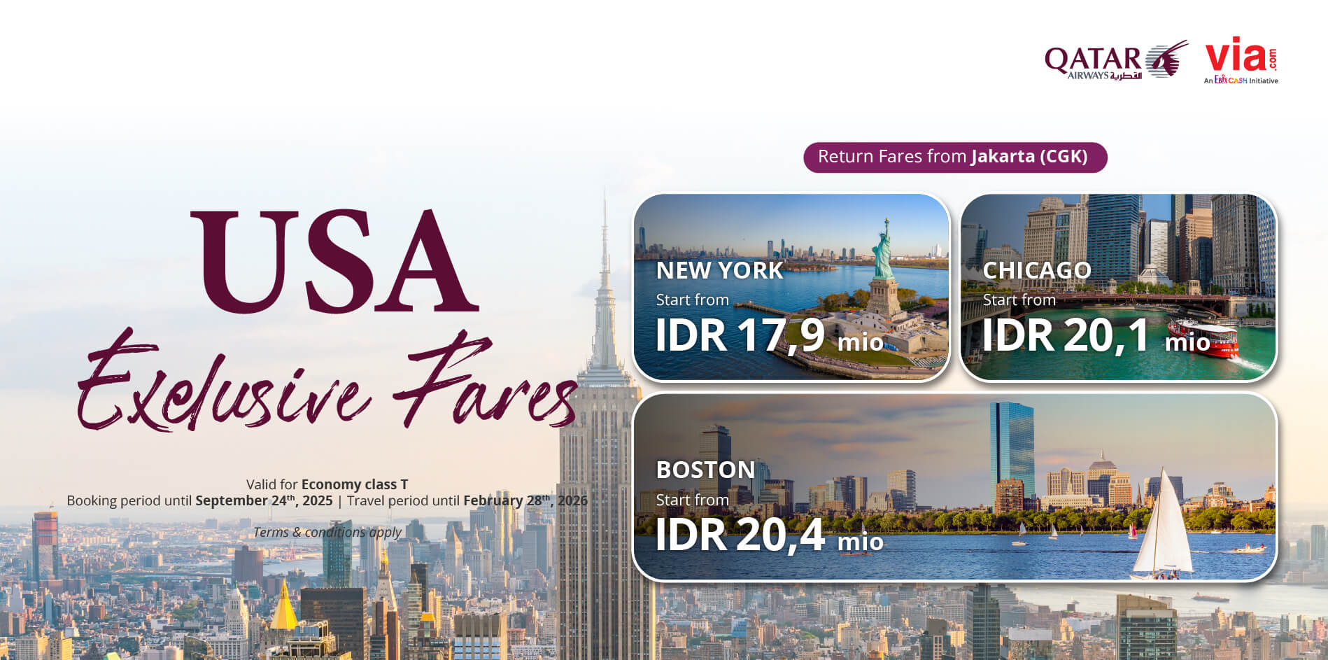 ​ Qatar Airways USA Exclusive Fares. Fly to New York, Chicago & Boston with comfort and style, start from IDR 17,9 Mio! Book now.