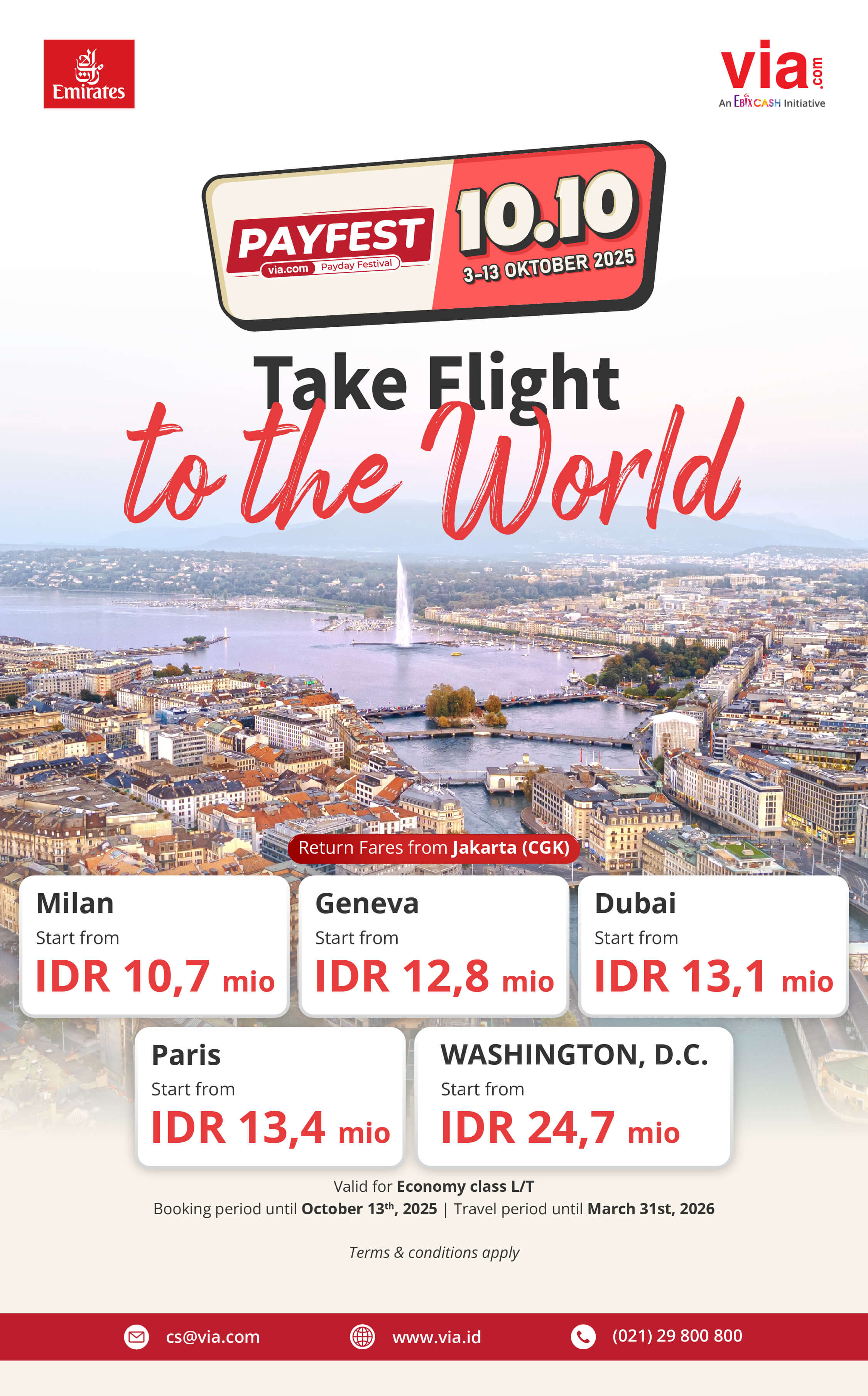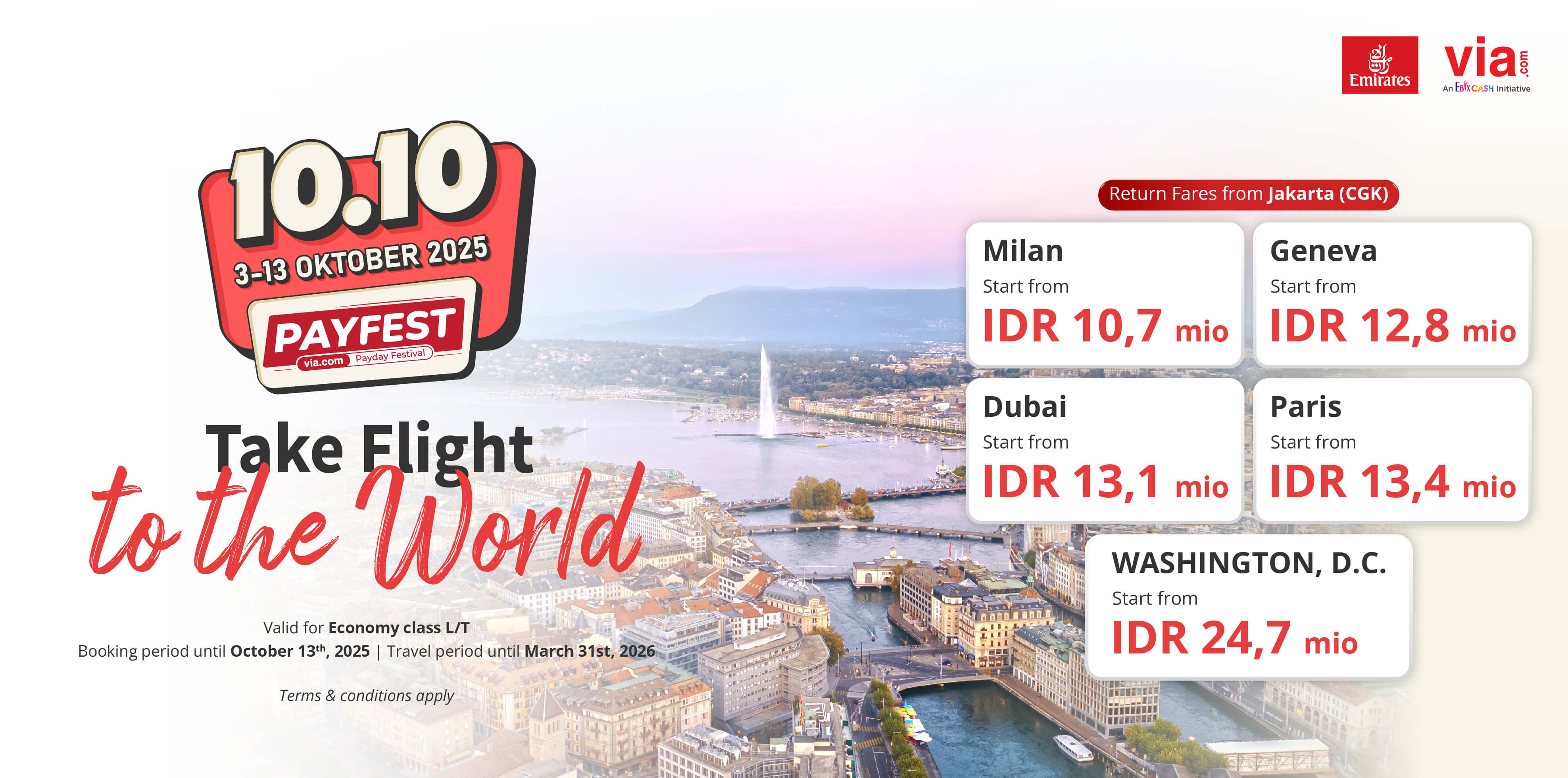 Take Flight to the World with Emirates! Discover Milan, Geneva, Dubai, Paris & Washington, D.C. exclusive fares from IDR 10.7 mio. Book now on PAYFEST 10.10!
